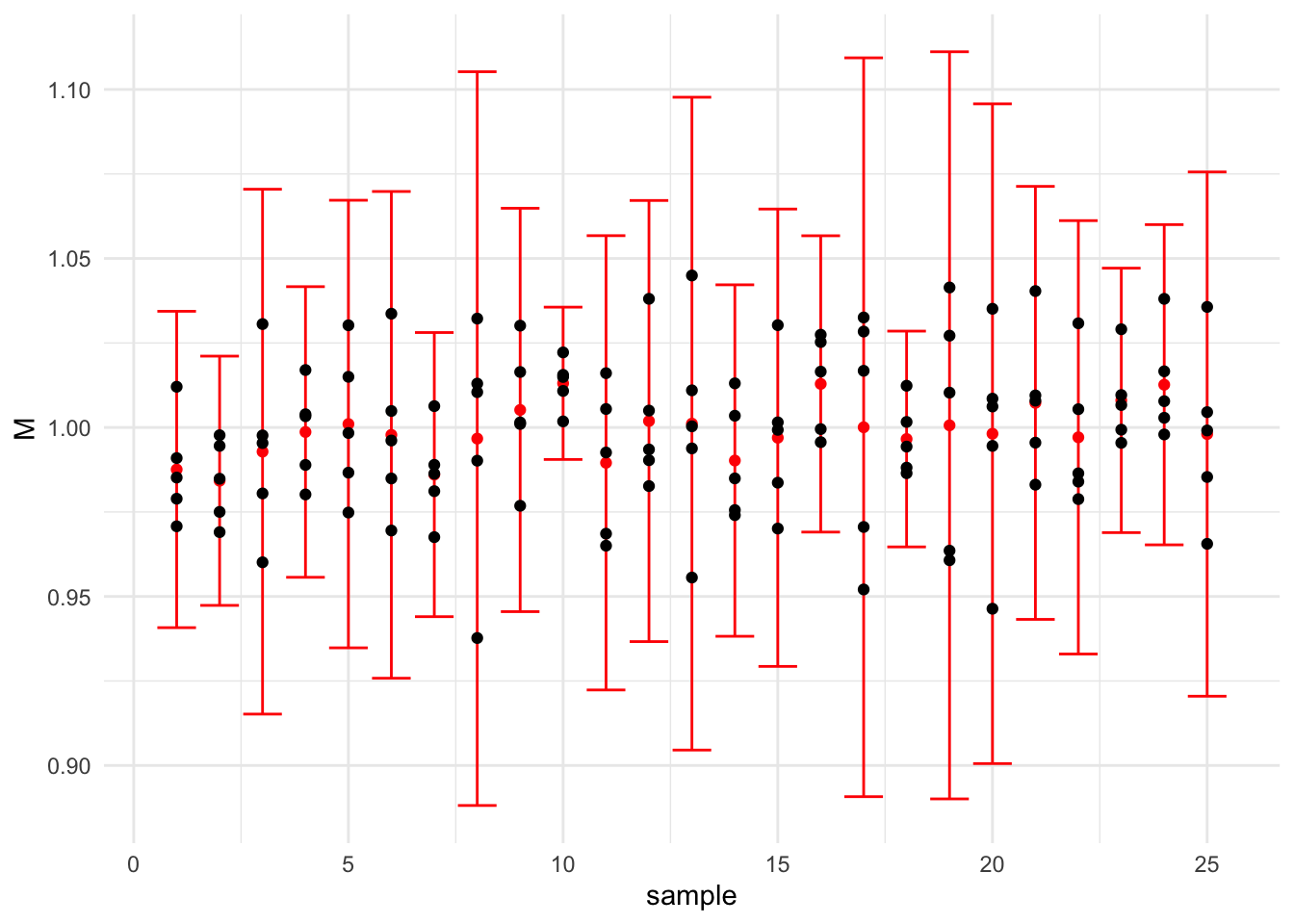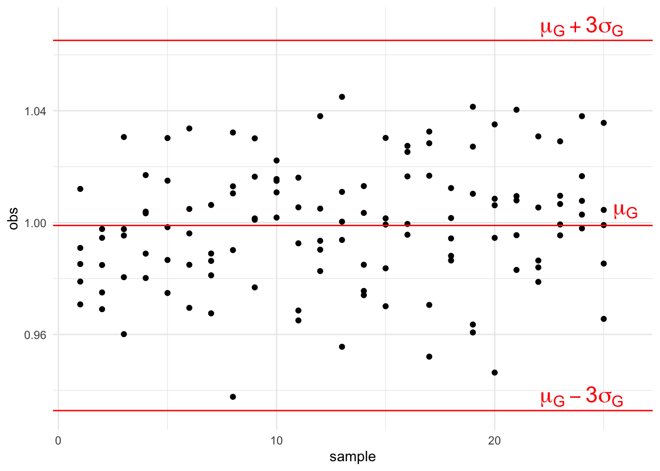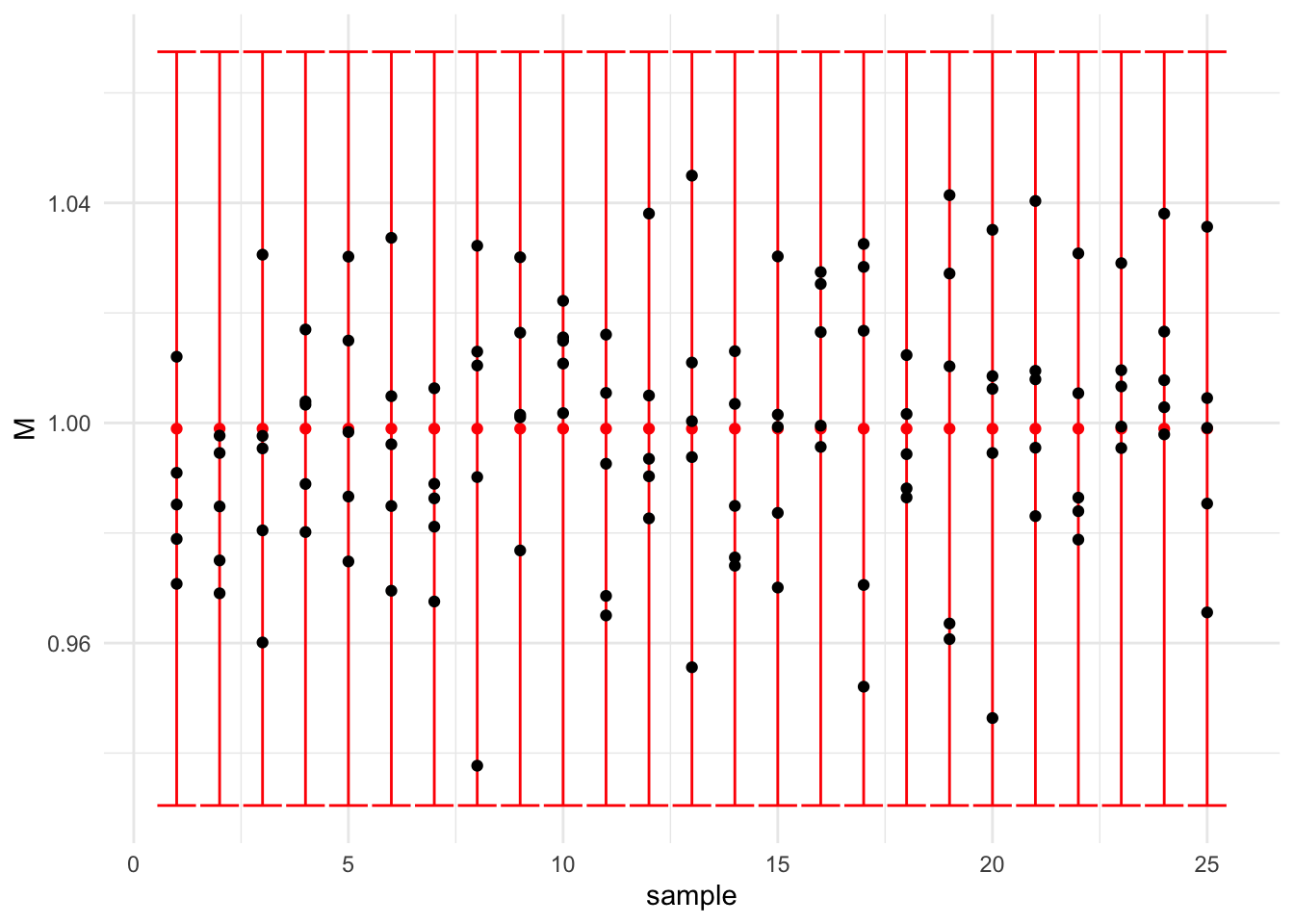 Exemple : on prélève à intervalles réguliers 25 échantillons de 5 unités de production. Les observations fluctuent autour de \(y=1\). Ces fluctuations sont aléatoires et peu importantes (\(\pm\) 5%).