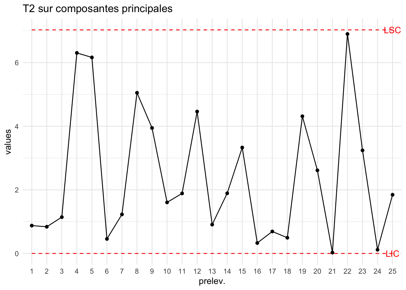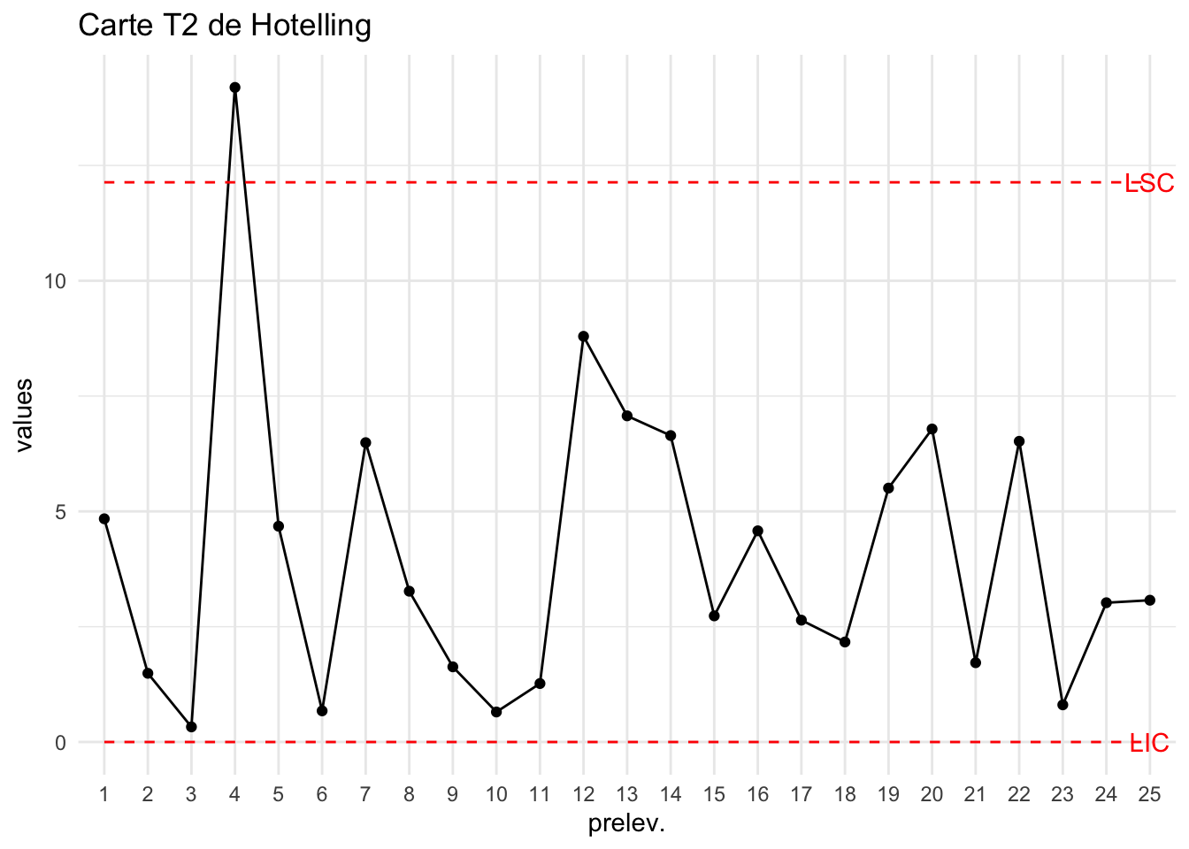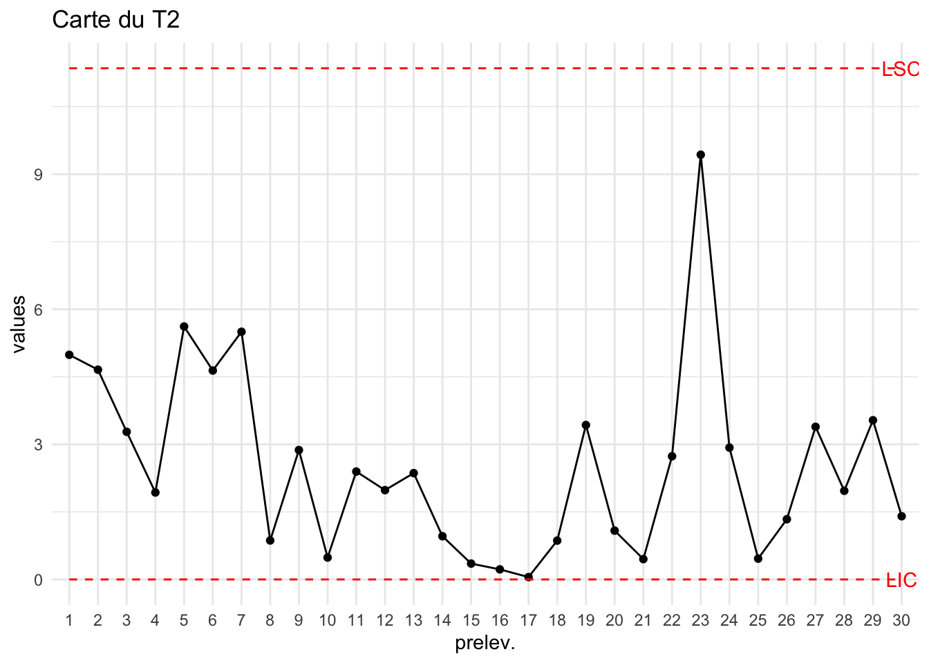 \(T_t^2\) donne une mesure de l’éloignement de la moyenne d’un prélèvement \(t\) par rapport à la moyenne de la production (en multidimensionnel) donc c’est une généralisation de la carte de Shewart de la moyenne.