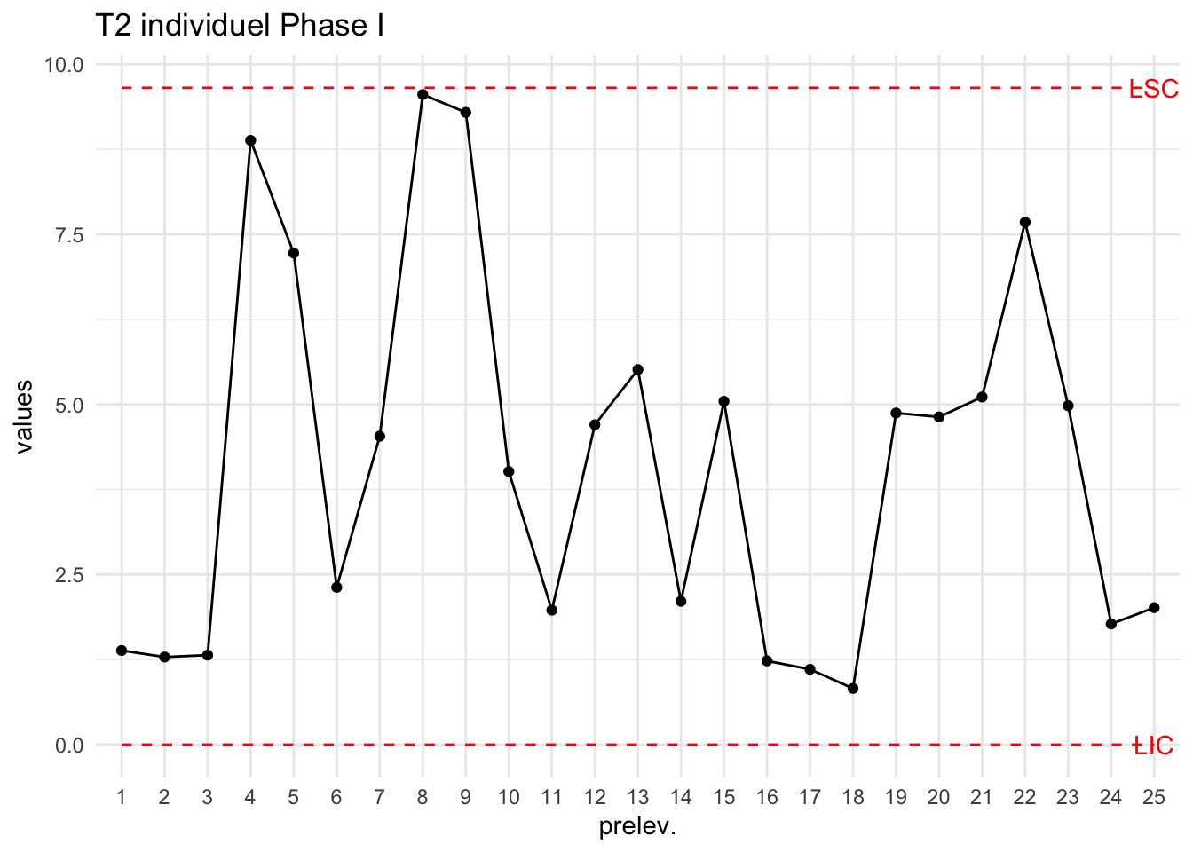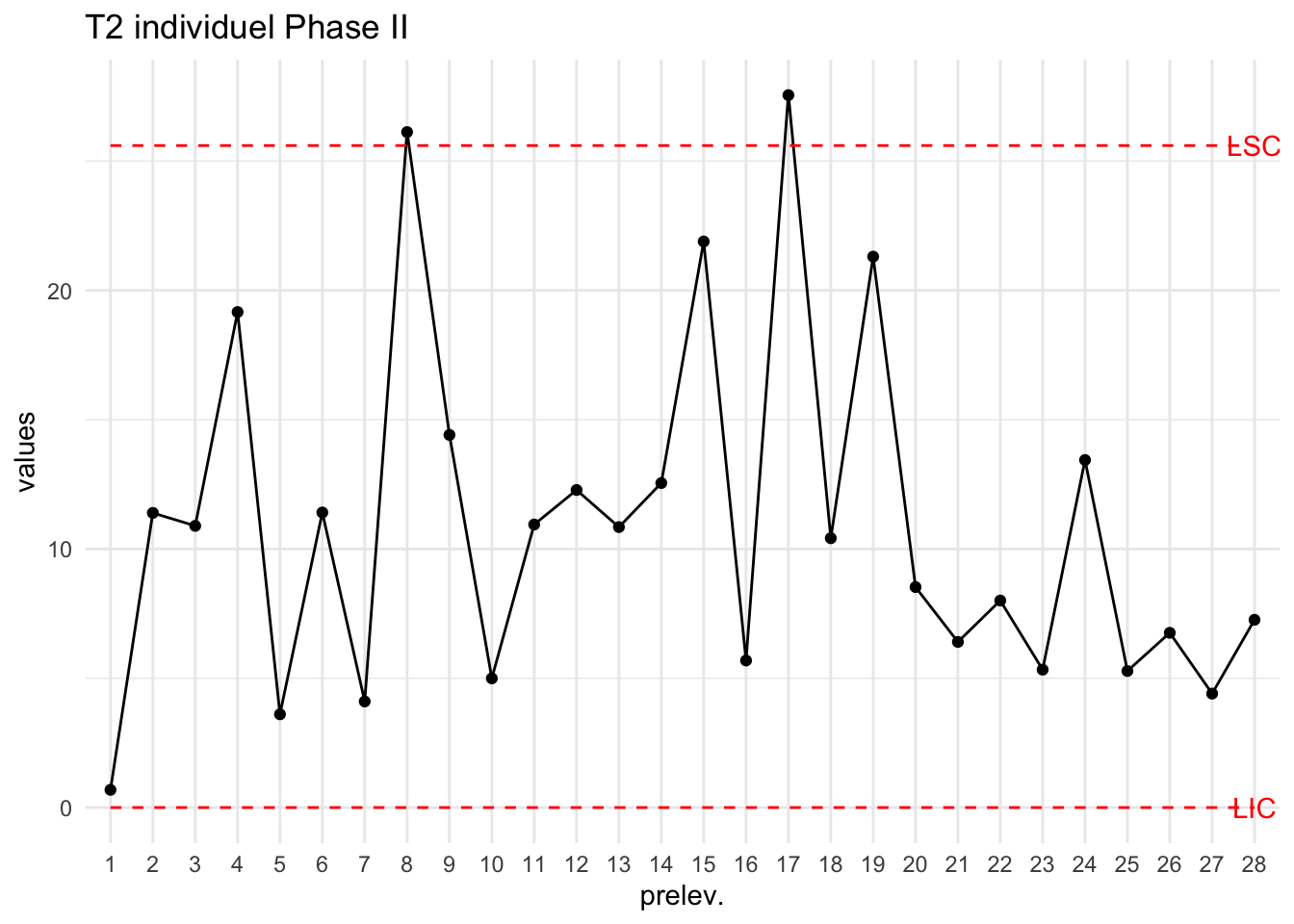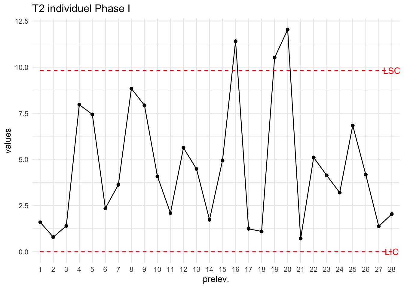 Pour la phase II (futures observations,[!] \(k\) est le nombre de prélèvements de la phase I) on pose : \[LSC=\frac{p(k+1)(n-1)}{kn-k-p+1}F_{(p,kn-k-p+1)}(1-\alpha).\]