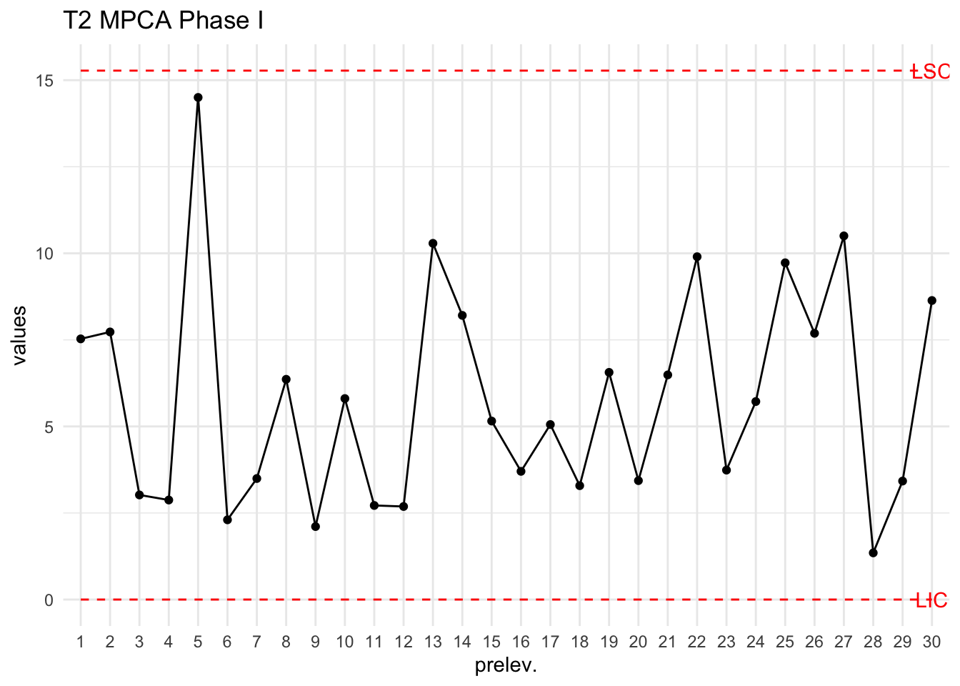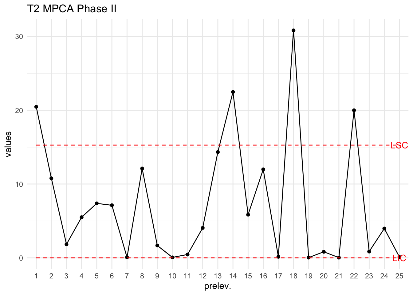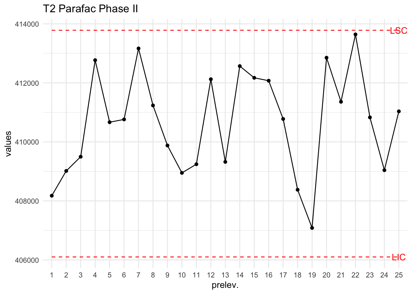 Pour la phase II (futures observations,[!] \(k\) est le nombre de prélèvements de la phase I) on pose : \[LSC=\frac{p(k+1)(n-1)}{kn-k-p+1}F_{(p,kn-k-p+1)}(1-\alpha).\]
