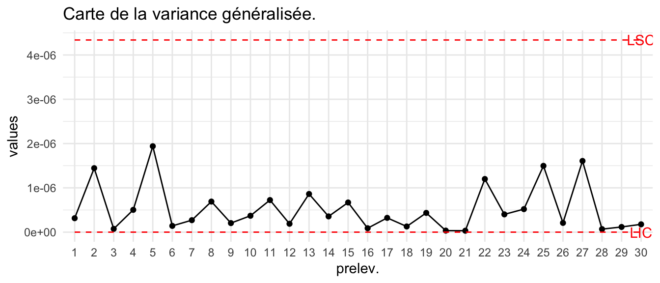 plot_chart(S$detSj,LIC=S$LIC,LSC=S$LSC,Type="Carte de la variance généralisée.")