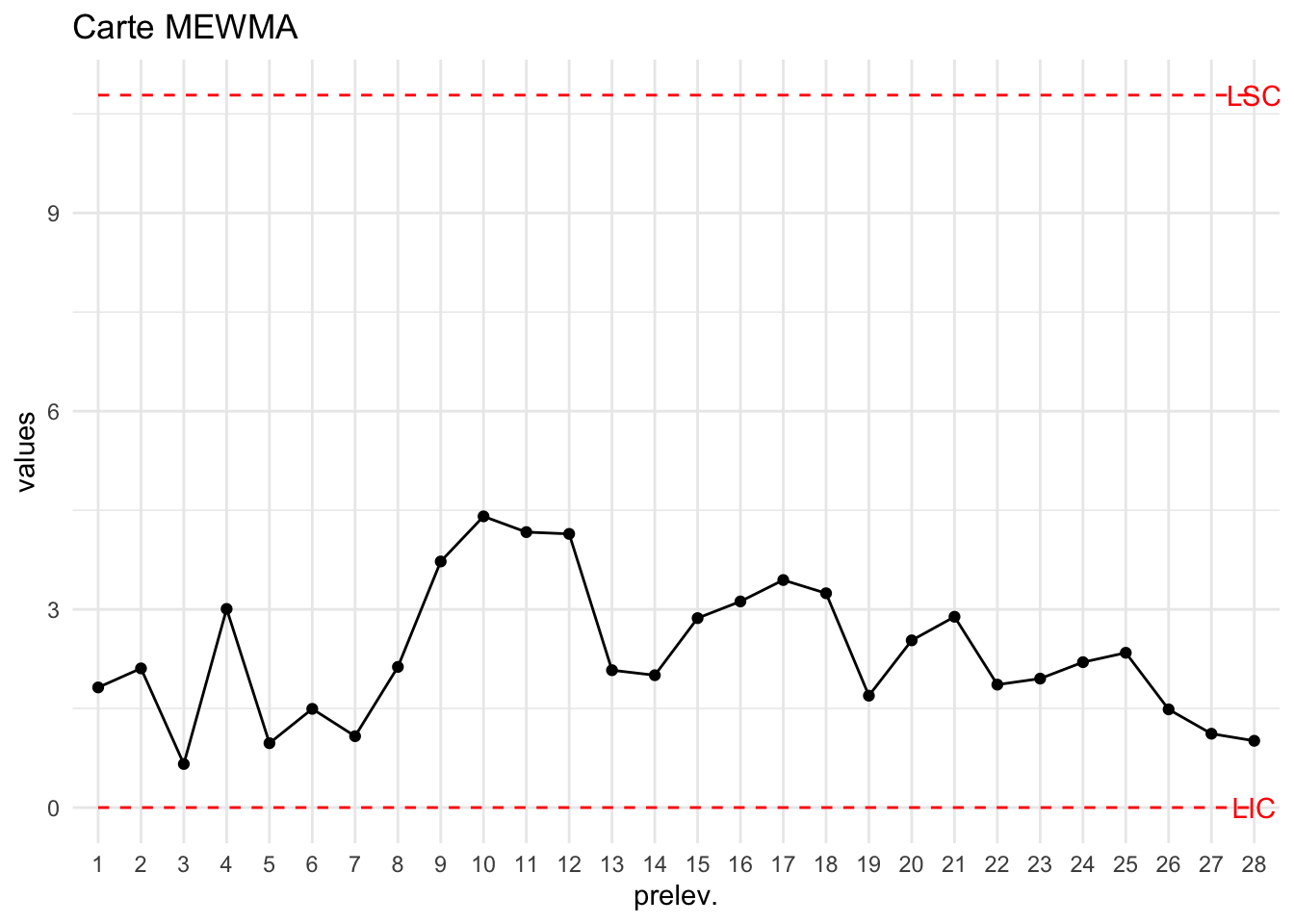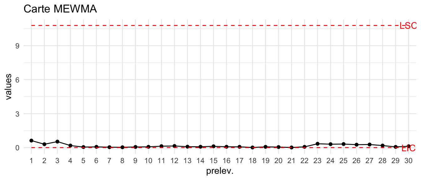 On généralise les cartes EWMA à \(p\) variables. Etant données les \(k\) moyennes \((\bar X_1,..,\bar X_k)\) où \(\bar X_t\in \mathbb R^p\), on calcule \[Z_t=\lambda \bar X_t+(1-\lambda)Z_{t-1},\] pour \(0<\lambda<1.\) En pratique on choisit souvent \(\lambda=0.1\).