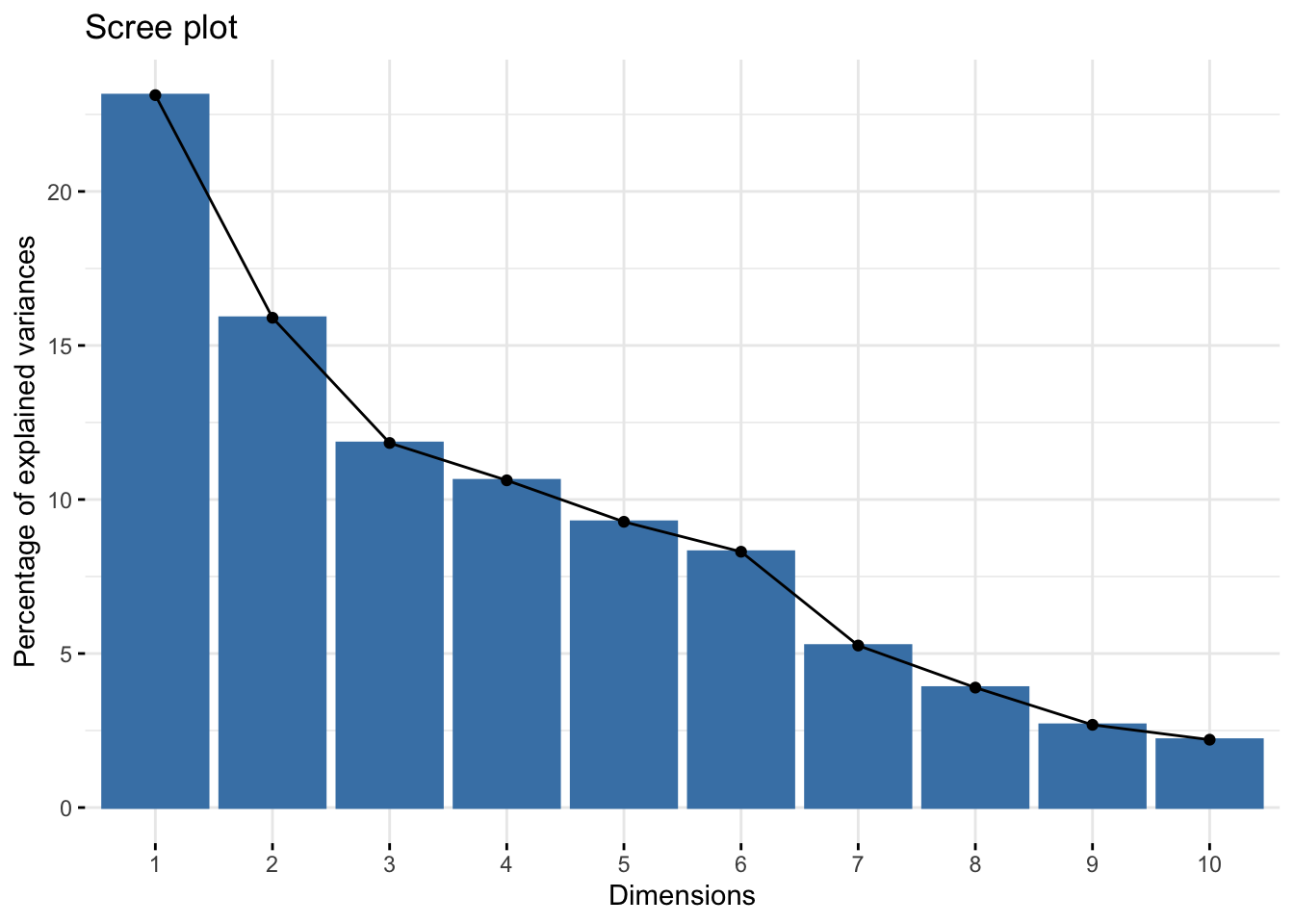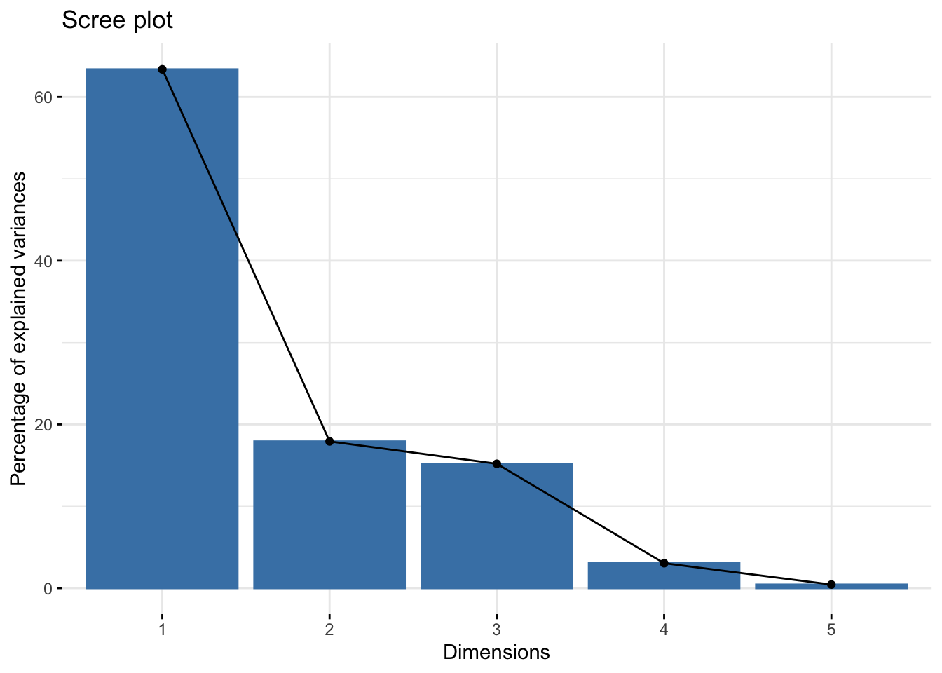 pca=PCA(X,scale.unit=F,graph = F)Le choix du nombre de composantes se fait en étudiant l’éboulis des valeurs propres