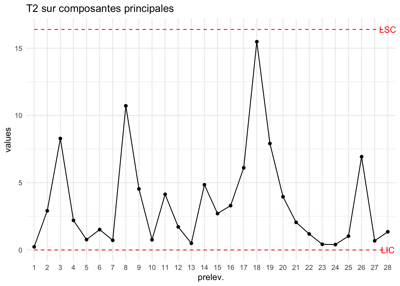 Deux prélèvements sont HC on va comme précédemment s’intéresser aux caractéristiques impliquant la présence de ces points HC. On peut pour ce faire regarder les cartes de contrôles univariées puis bivariée en ces points.