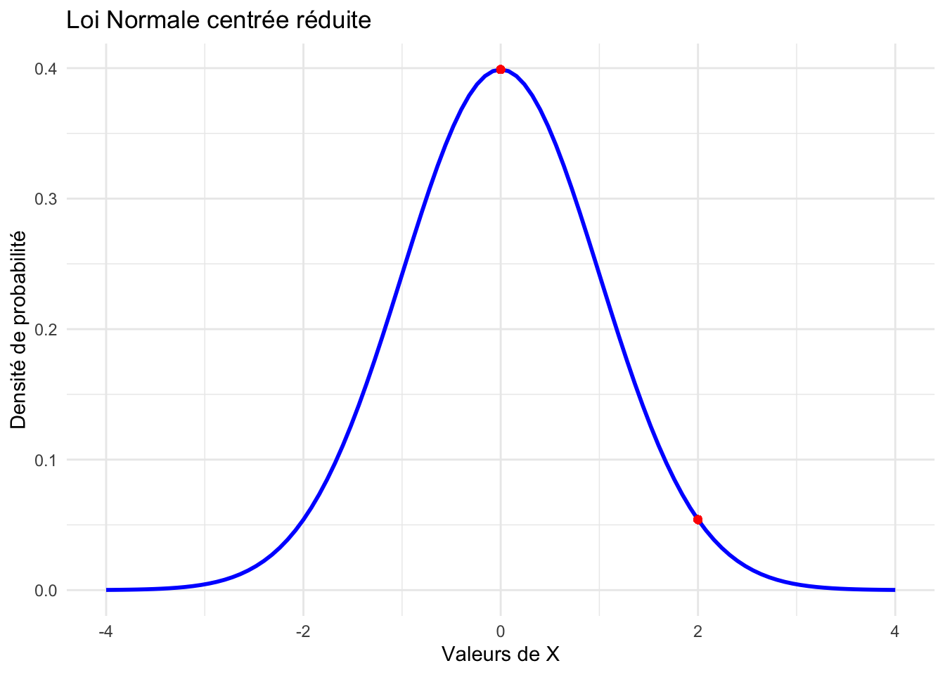 La densité de probabilité de \(X\sim \mathcal N(\mu,\sigma)\) est pour \(x\in \mathbb R\) \[f(x)=\frac{1}{\sigma\sqrt{2\pi}}e^{-\frac1{2}[\sigma^{-1}(x-\mu)]^2}.\]