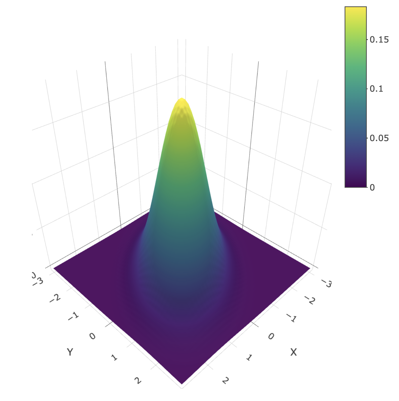 La densité de probabilité de \((X_1,...,X_p)\sim \mathcal N_p(\mu,\Sigma)\) est pour \(x=(x_1,...,x_p)\in \mathbb R^p\) \[f_p(x)=\frac{1}{|\Sigma|^{-1/2}\sqrt{2\pi}}e^{-\frac1{2}[(x-\mu)^T\Sigma^{-1}(x-\mu)]}.\]